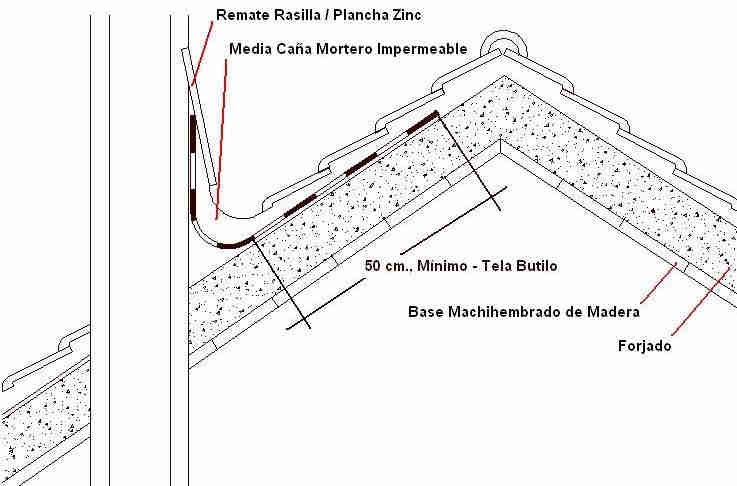 Deben arrancarse las tejas que dan a la parte vertical de dicho conducto sobre la que recibe el agua de lluvia, hasta llegar al forjado. Sobre el mismo y en una franja de unos 50cm, se debe disponer una tela de butilo, rematada con tra la pared del conducto de la chimenea y formando un canal con mortero impermeabilizado, según detalle: