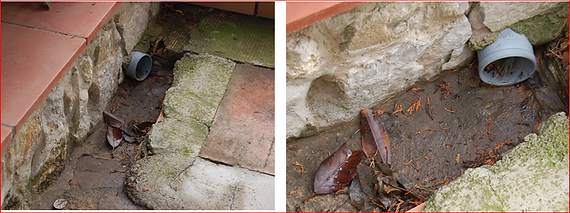 En la acera del lado izquierdo de la vivienda y justo antes del acceso a la terraza, existe un desagüe que queda encajonado por debajo del resalte del pavimento de la escalera, tal y como puede verse en las fotos adjuntas.
