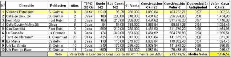 De dicho cuadro, una vez uniformizados los valores de las viviendas hasta el Año 2008, en función de su antigüedad, se llega a la conclusión de que el Valor de una Vivienda en esta zona es de: 1.156,52 €/m2.*[1]